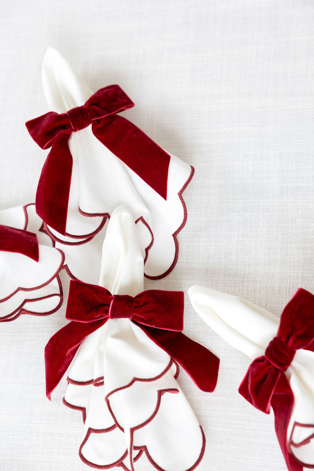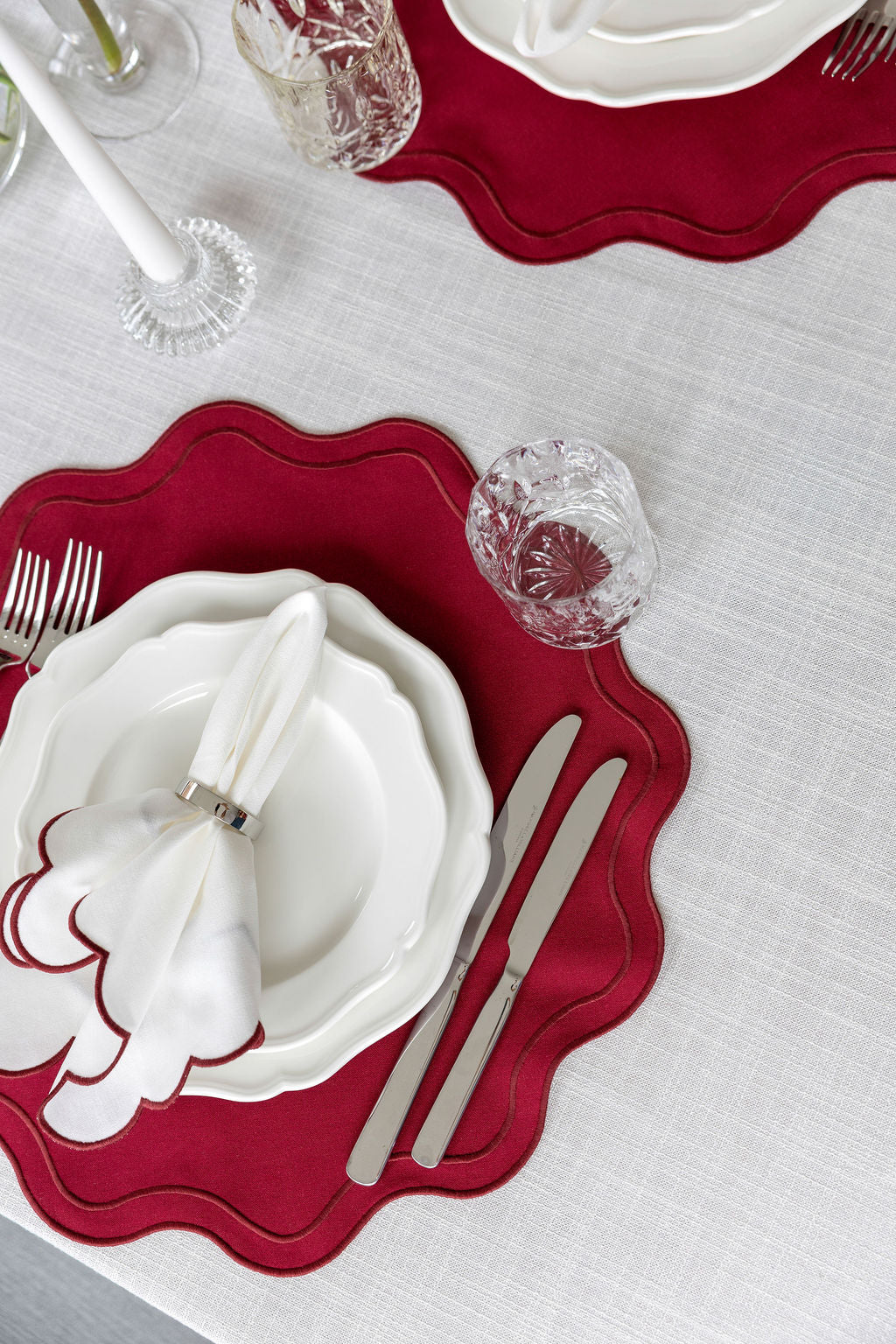 Embroidered scallop Napkins, with a delicate burgundy edge. A beautiful blend of European linen and cotton for a sustainable, durable and easy to care product. OEKO-TEX certified.